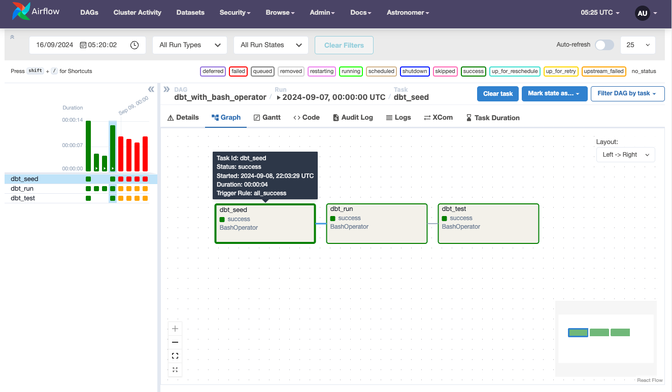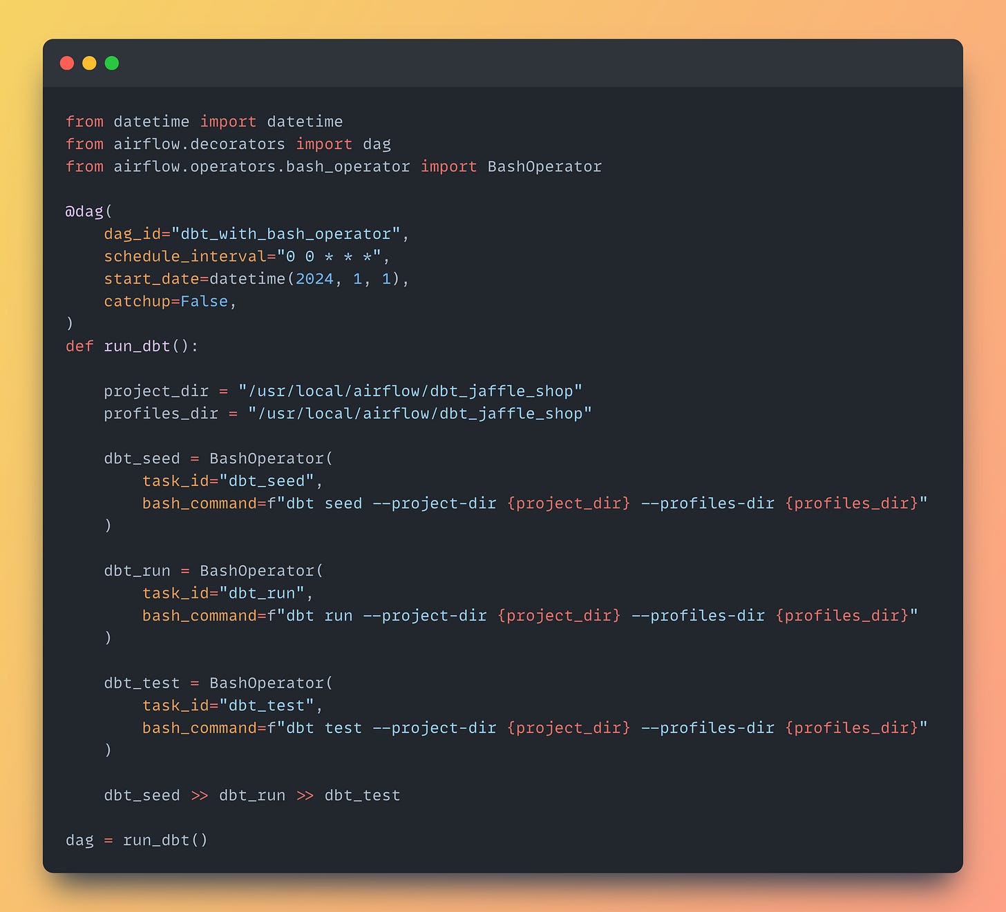 Once that's done, you can simply create a DAG that uses BashOperator to trigger dbt commands. Here's a sample code that runs three dbt commands: seed, run, and test: