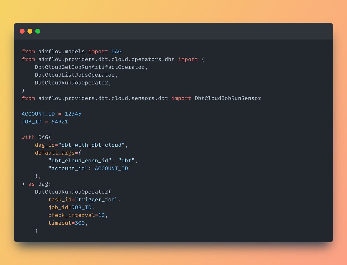 This DAG simply triggers a dbt job configured in dbt Cloud environment. It also is possible to make this task DbtCloudRunJobOperator asyncronous by providing wait_for_termination=False argument.